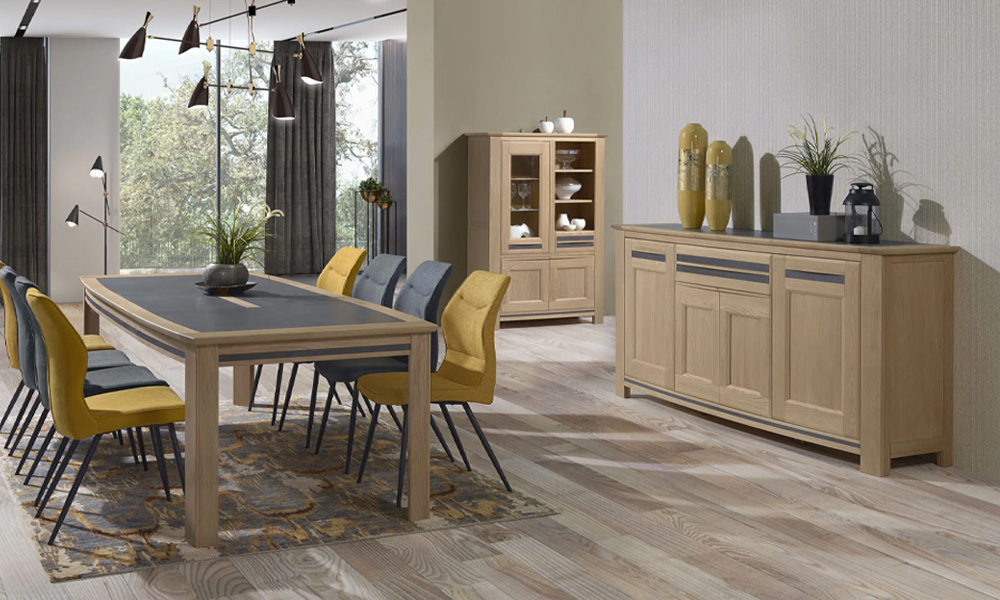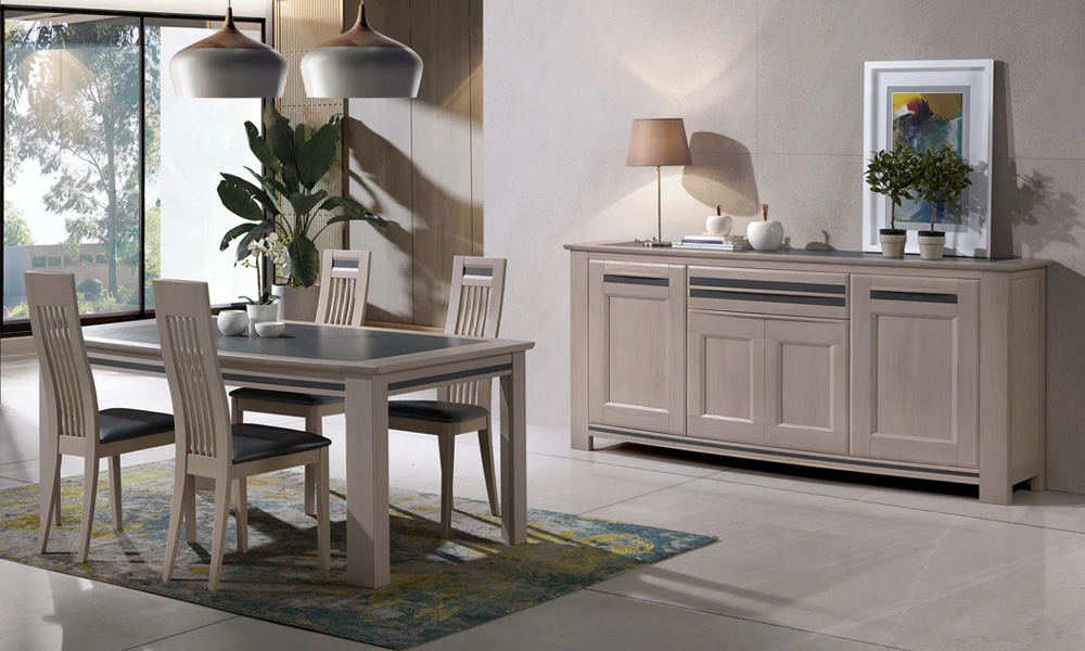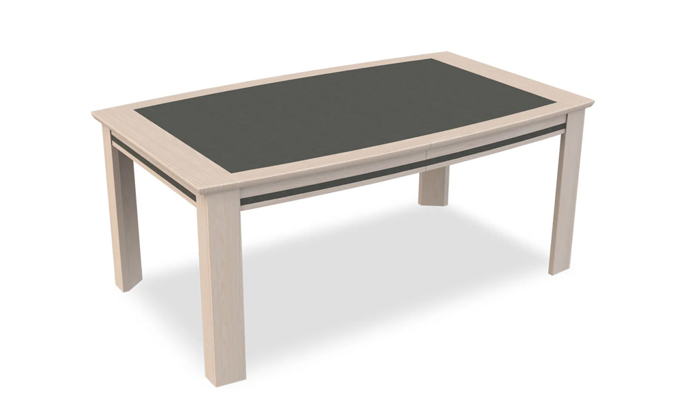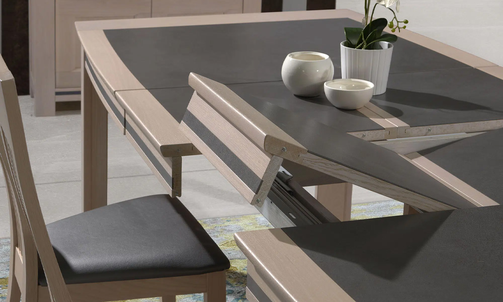 Table plateaux et allonges avec céramique. 3 finitions : naturel, naturel blanchi et sable.