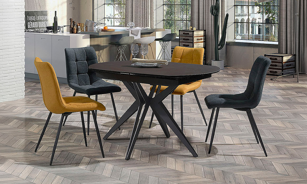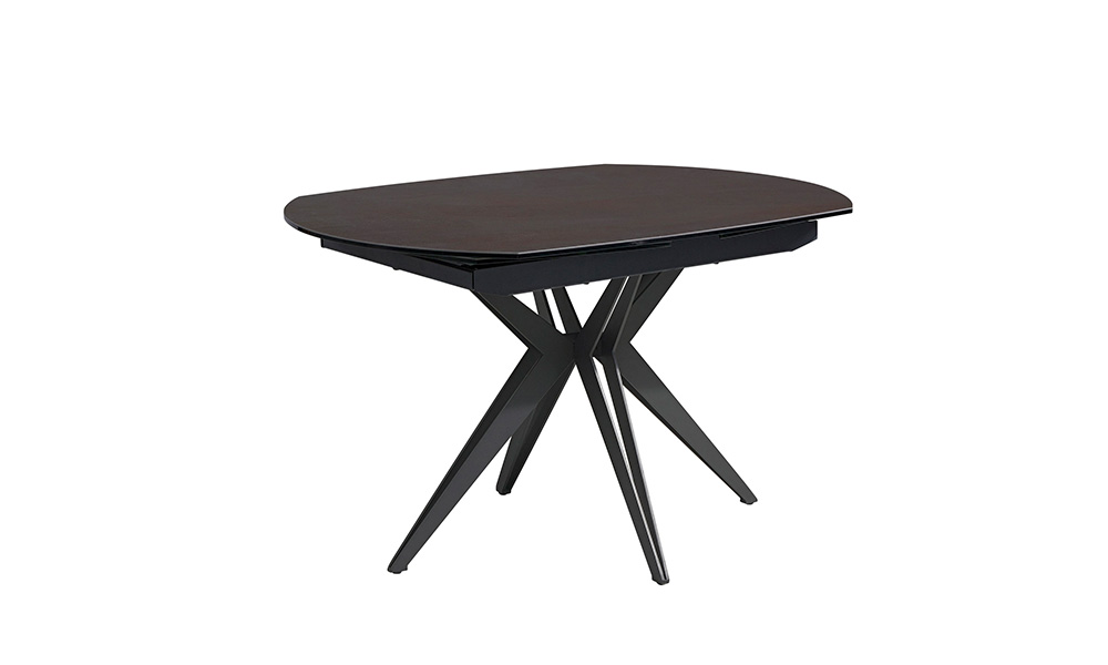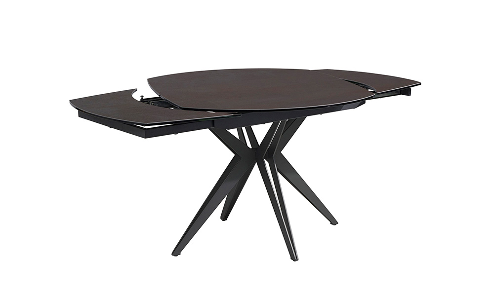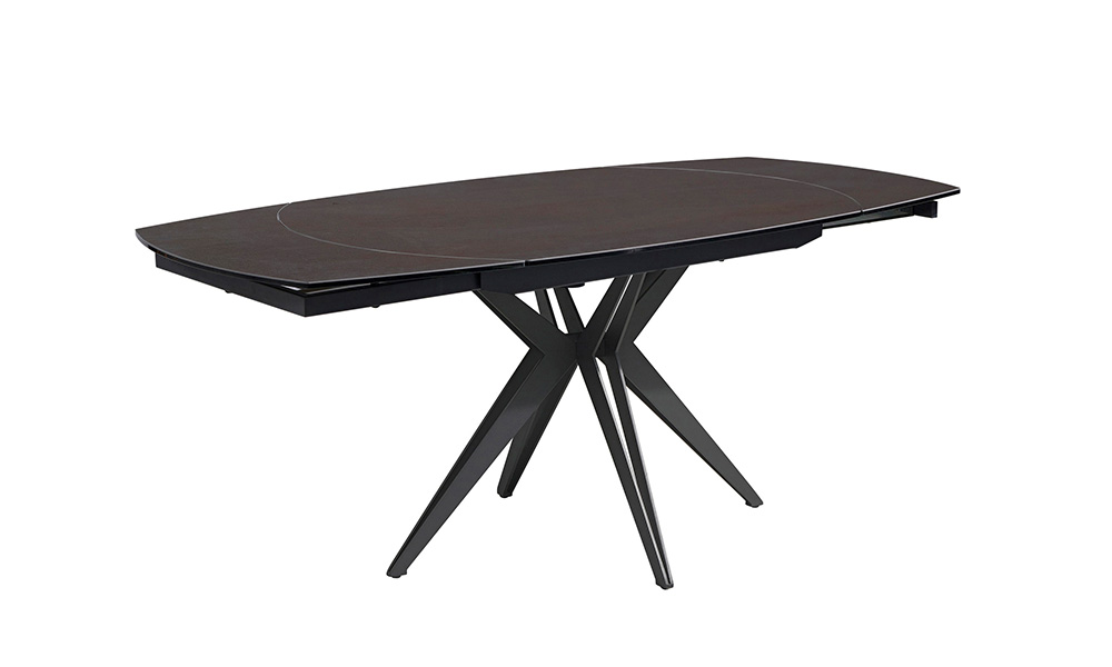 Table ovale 2 allonges en bout escamotables de 30 cm par rotation du plateau à 180°. Plateau céramique 13 mm. Piétement métal gris anthracite finition poudre. Céramique collée sur verre 10 mm.