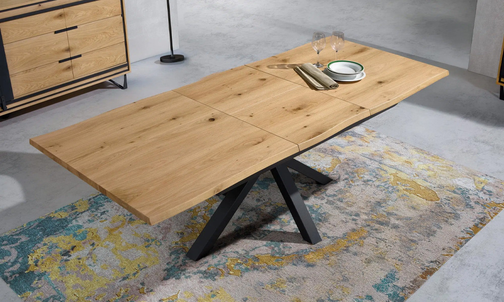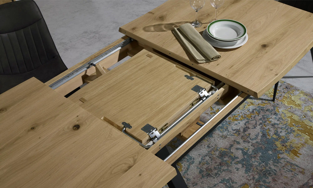 Table de repas pied central, piètement métal. Traverses, structure intérieure hêtre massif. Plateaux et allonges bois massif latté alaisé chêne massif, revêtus de placage chêne.